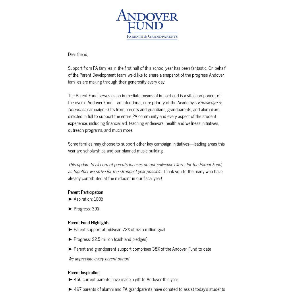 This update to all current parents focuses on our collective efforts for the Parent Fund, as together we strive for the strongest year possible. Thank you to the many who have already contributed at the midpoint in our fiscal year!
