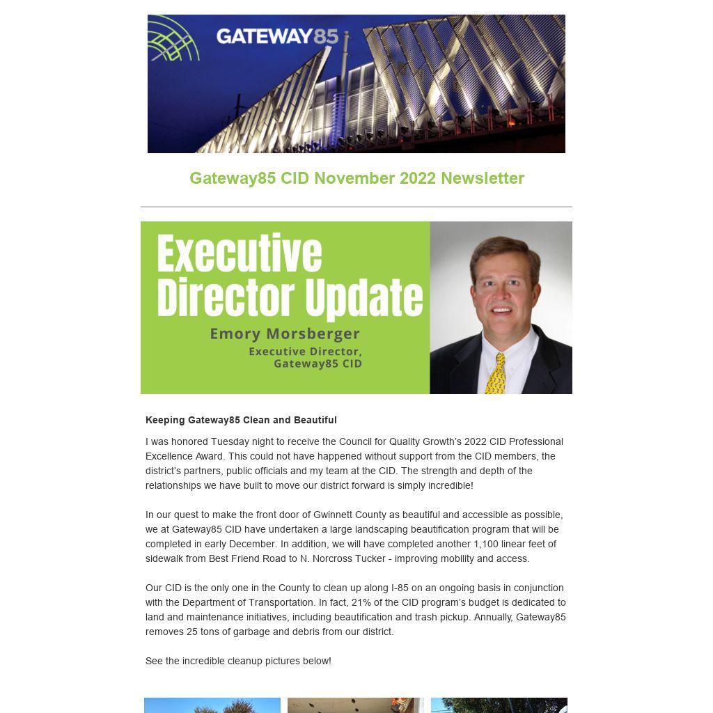 On November 15, Council for Quality Growth recognized Gateway85 Executive Director Emory Morsberger with the Professional Excellence CID award in honor of his successful career of leadership, dedication and professional excellence in serving metro area CIDs for the past 35 years. The event was hosted on the Comcast Center rooftop at The Battery Atlanta and presented by Cumberland CID and Georgia Power.