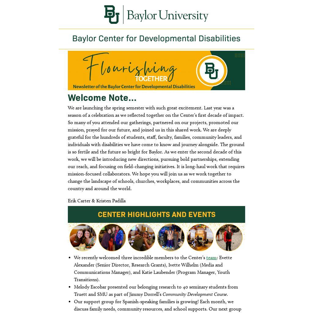 We are launching the spring semester with such great excitement. Last year was a season of a celebration as we reflected together on the Center’s first decade of impact. So many of you attended our gatherings, partnered on our projects, promoted our mission, prayed for our future, and joined us in this shared work. We are deeply grateful for the hundreds of students, staff, faculty, families, community leaders, and individuals with disabilities we have come to know and journey alongside. The ground is so fertile and the future so bright for Baylor. As we enter the second decade of this work, we will be introducing new directions, pursuing bold partnerships, extending our reach, and focusing on field-changing initiatives. It is long-haul work that requires mission-focused collaborators. We hope you will join us as we work together to change the landscape of schools, churches, workplaces, and communities across the country and around the world.