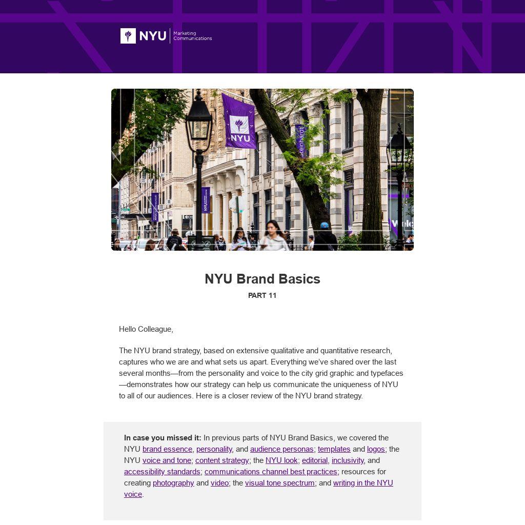 We conducted the research behind this NYU brand strategy, which included competitive benchmarks and reputational studies among all of our audiences, in partnership with SimpsonScarborough, a leading brand management firm specializing in higher education. To learn more about the research insights that led to the development of each strategic driver and brand pillar, refer to pages 13 to 19 of our brand guidelines.