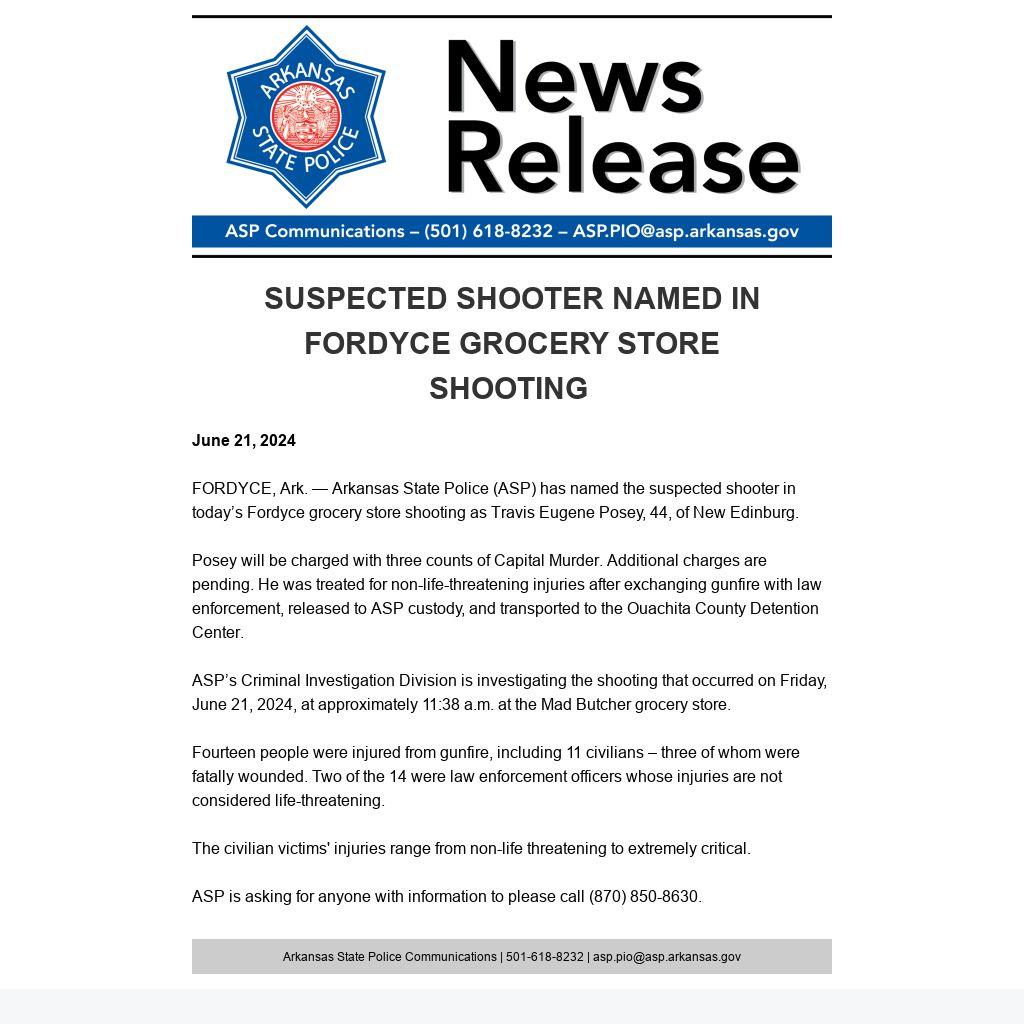 FORDYCE, Ark. — Arkansas State Police (ASP) has named the suspected shooter in today’s Fordyce grocery store shooting as Travis Eugene Posey, 44, of New Edinburg.