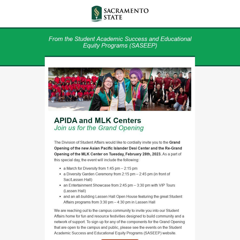 The Division of Student Affairs would like to cordially invite you to the Grand Opening of the new Asian Pacific Islander Desi Center and the Re-Grand Opening of the MLK Center on Tuesday, February 28th, 2023. As a part of this special day, the event will include the following: