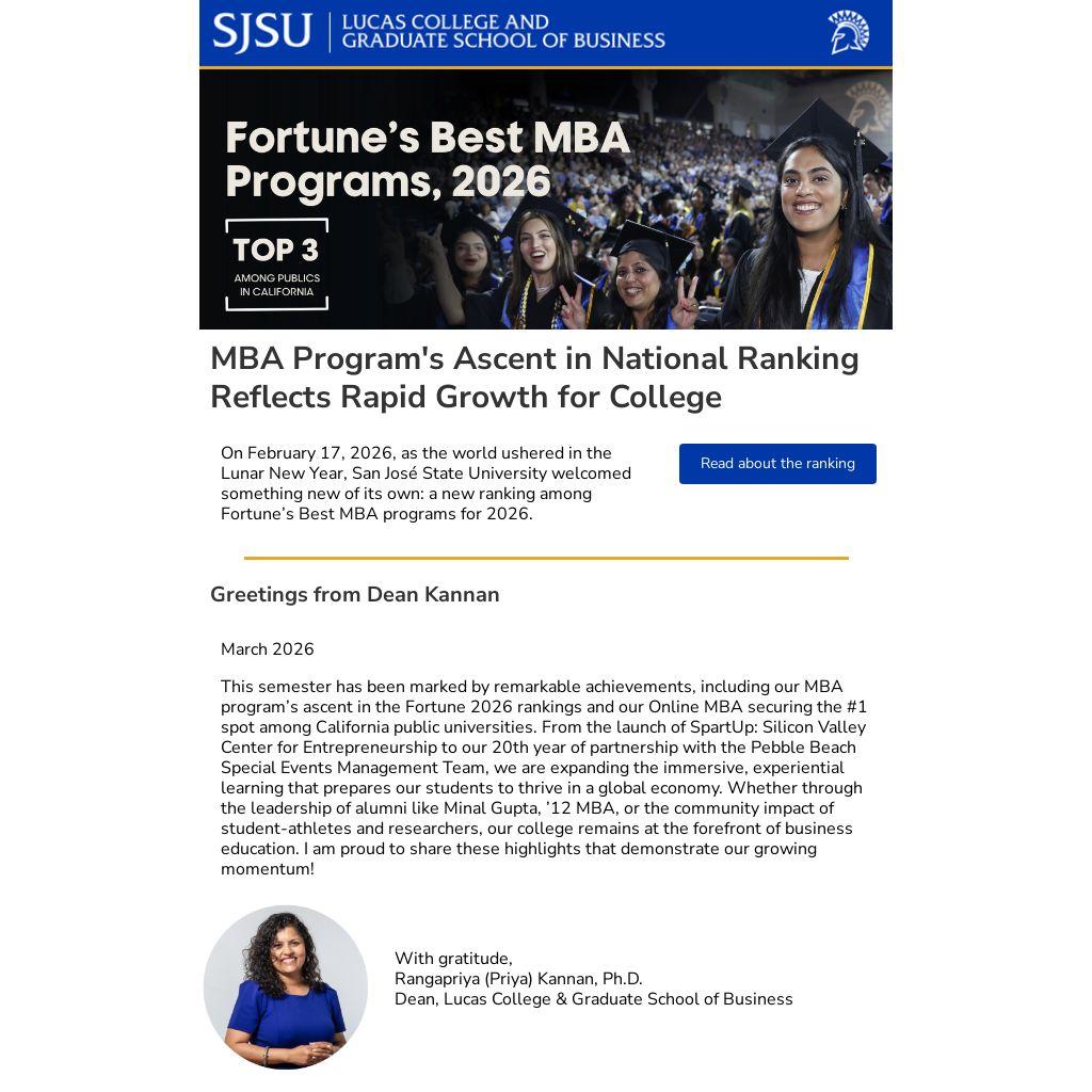 This semester has been marked by remarkable achievements, including our MBA program’s ascent in the Fortune 2026 rankings and our Online MBA securing the #1 spot among California public universities. From the launch of SpartUp: Silicon Valley Center for Entrepreneurship to our 20th year of partnership with the Pebble Beach Special Events Management Team, we are expanding the immersive, experiential learning that prepares our students to thrive in a global economy. Whether through the leadership of alumni like Minal Gupta, ’12 MBA, or the community impact of student-athletes and researchers, our college remains at the forefront of business education. I am proud to share these highlights that demonstrate our growing momentum!