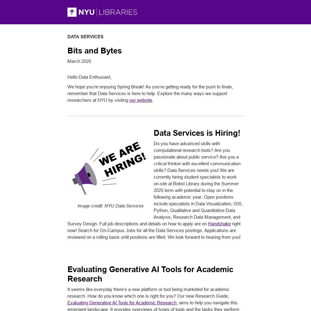 Do you have advanced skills with computational research tools? Are you passionate about public service? Are you a critical thinker with excellent communication skills? Data Services needs you! We are currently hiring student specialists to work on-site at Bobst Library during the Summer 2025 term with potential to stay on in the following academic year. Open positions include specialists in Data Visualization, GIS, Python, Qualitative and Quantitative Data Analysis, Research Data Management, and Survey Design. Full job descriptions and details on how to apply are on Handshake right now! Search for On-Campus Jobs for all the Data Services postings. Applications are reviewed on a rolling basis until positions are filled. We look forward to hearing from you!