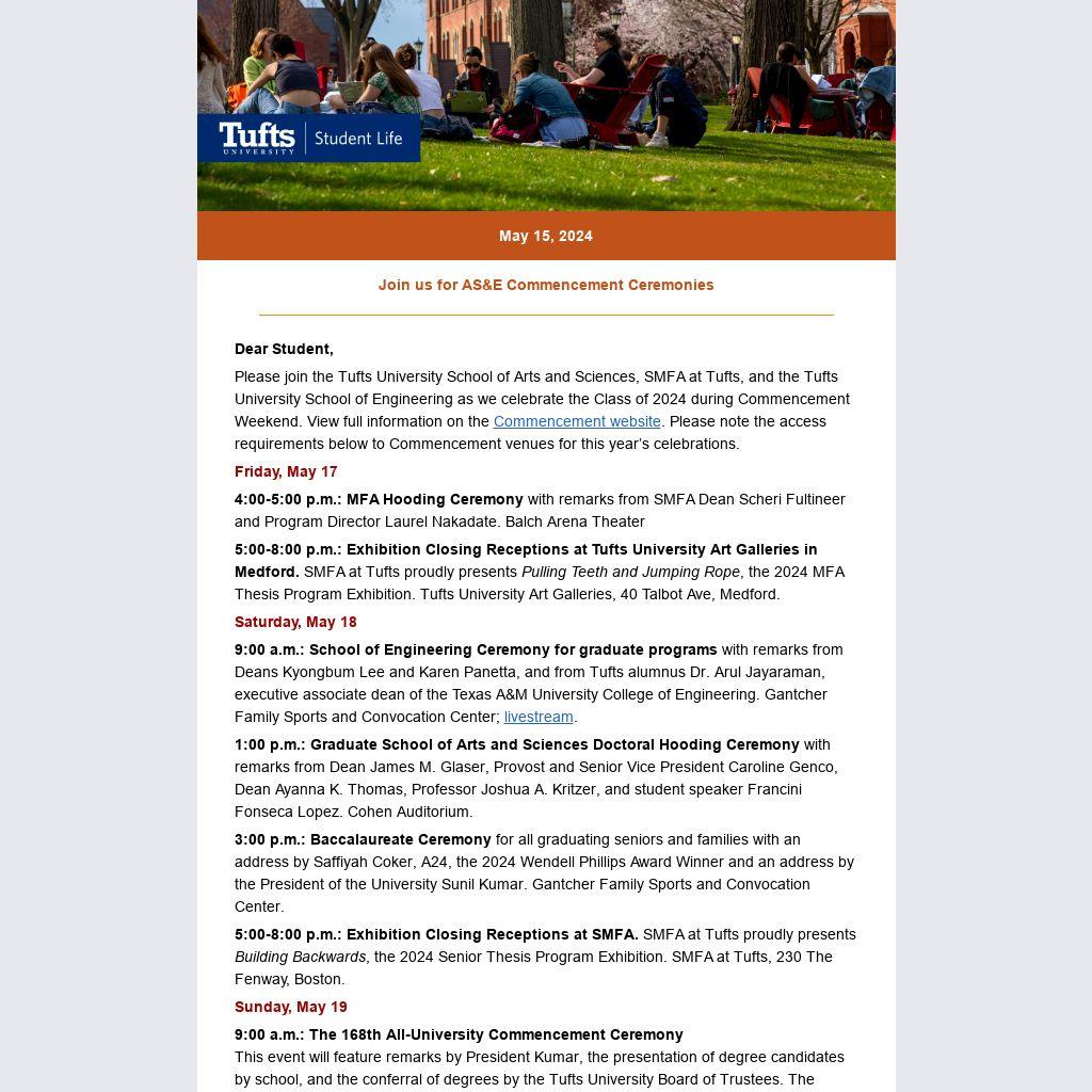 Please join the Tufts University School of Arts and Sciences, SMFA at Tufts, and the Tufts University School of Engineering as we celebrate the Class of 2024 during Commencement Weekend. View full information on the Commencement website. Please note the access requirements below to Commencement venues for this year’s celebrations.