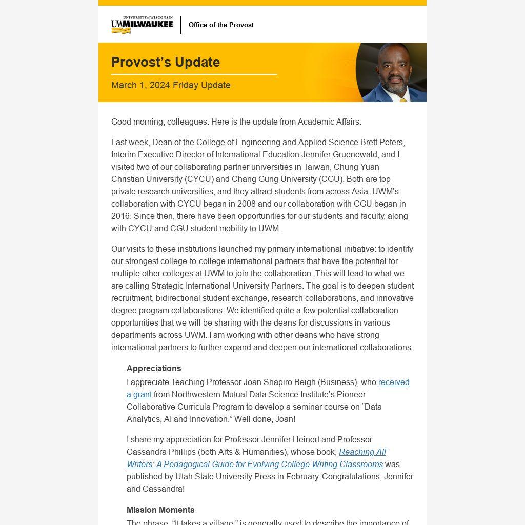 I will be joining Chancellor Mone and Senior Vice Chancellor Robin Van Harpen for a virtual town hall meeting on Wednesday, March 13 from 9:30-10:30 a.m. We will discuss the current environment facing higher education across the nation; 2024-25 budget planning; updates on 2030 plans and progress; student success and enrollment; and growing our culture of care. Questions can be shared in advance or asked during the live event by emailing uwm-townhall@uwm.edu. The meeting will be held via Zoom. If you are unable to watch it live, a recording will be posted on the Chancellor’s webpage. Join the town hall.