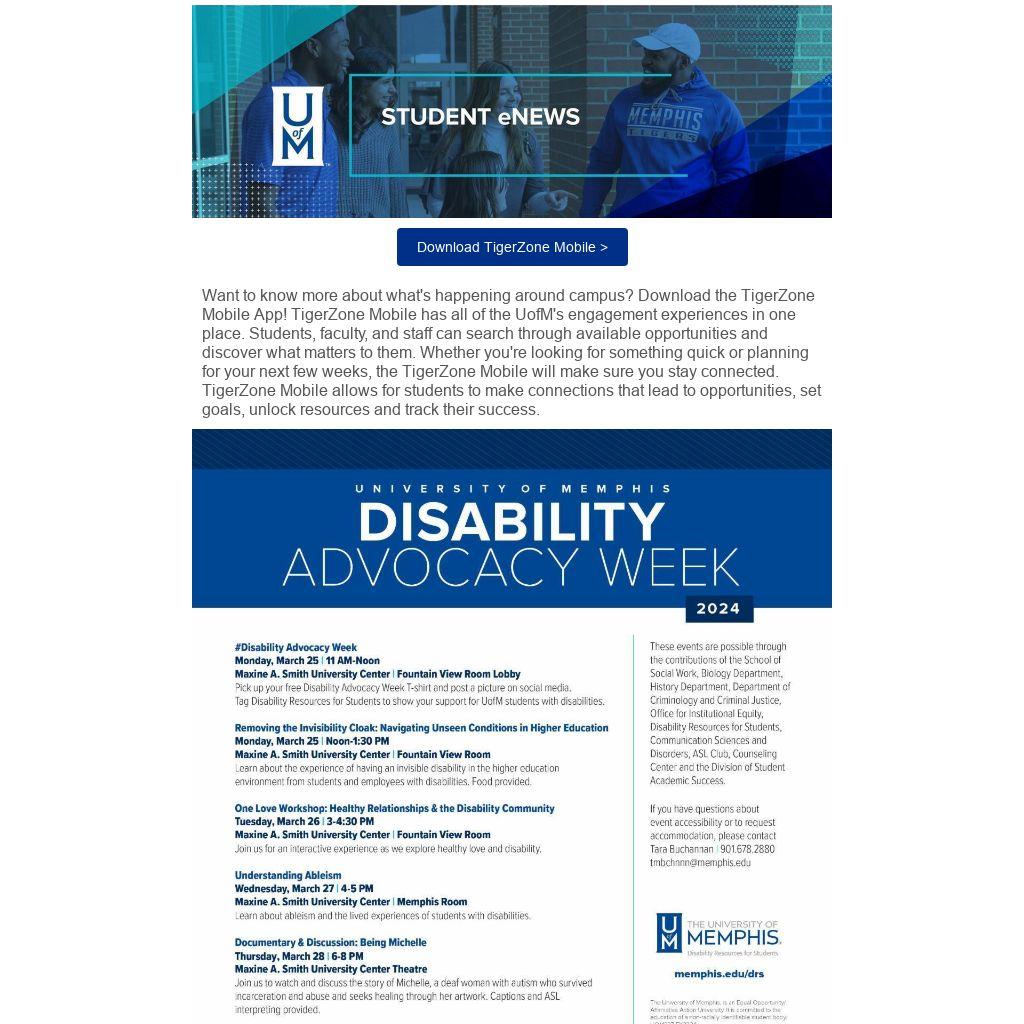 Want to know more about what's happening around campus? Download the TigerZone Mobile App! TigerZone Mobile has all of the UofM's engagement experiences in one place. Students, faculty, and staff can search through available opportunities and discover what matters to them. Whether you're looking for something quick or planning for your next few weeks, the TigerZone Mobile will make sure you stay connected. TigerZone Mobile allows for students to make connections that lead to opportunities, set goals, unlock resources and track their success.