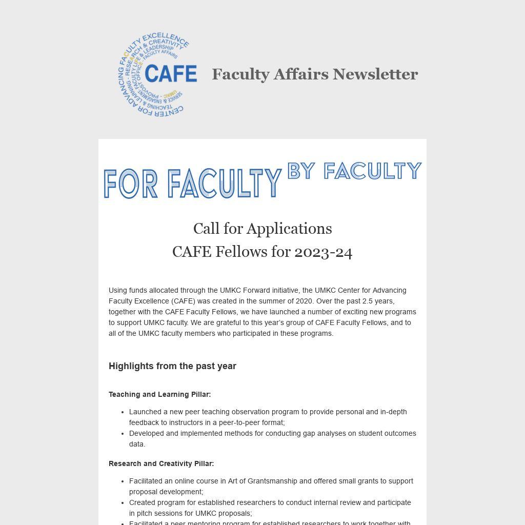 Using funds allocated through the UMKC Forward initiative, the UMKC Center for Advancing Faculty Excellence (CAFE) was created in the summer of 2020. Over the past 2.5 years, together with the CAFE Faculty Fellows, we have launched a number of exciting new programs to support UMKC faculty. We are grateful to this year’s group of CAFE Faculty Fellows, and to all of the UMKC faculty members who participated in these programs.