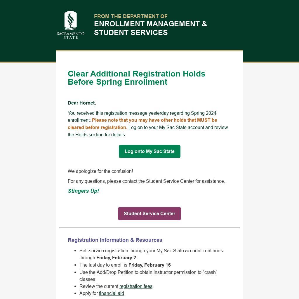 You received this registrationmessage yesterday regarding Spring 2024 enrollment. Please note that you may have other holds that MUST be cleared before registration. Log on to your My Sac State account and review the Holds section for details.