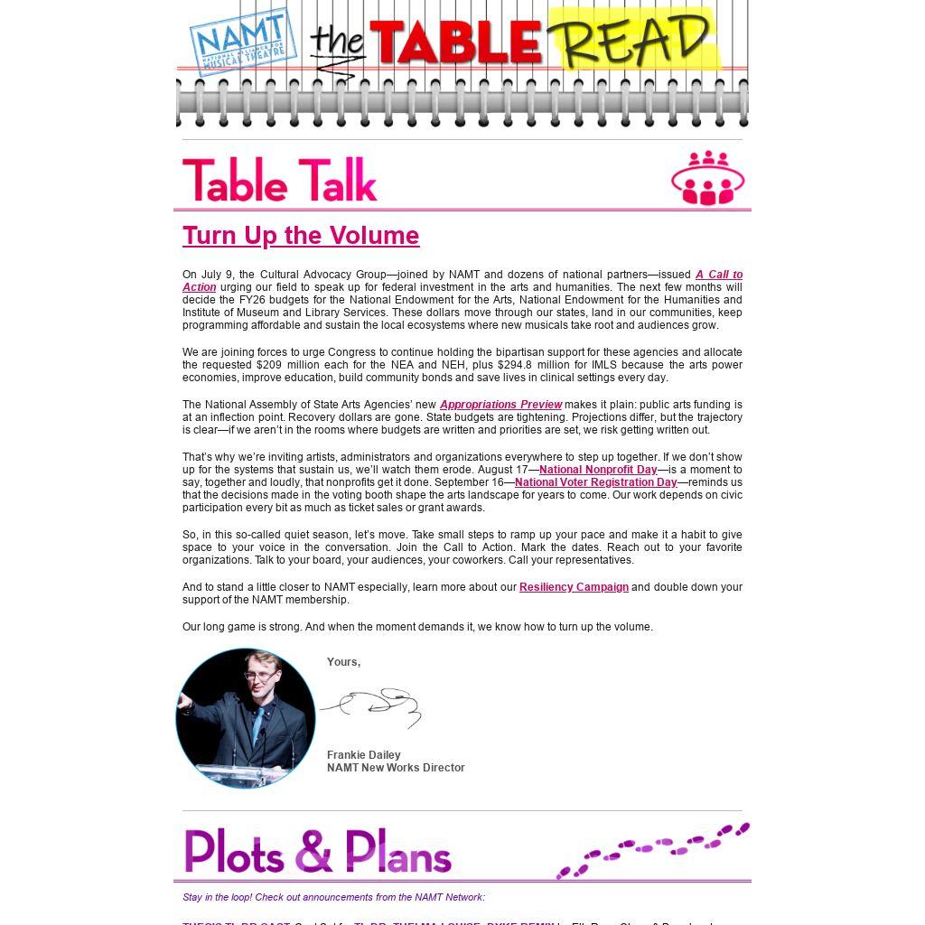 On July 9, the Cultural Advocacy Group—joined by NAMT and dozens of national partners—issued A Call to Action urging our field to speak up for federal investment in the arts and humanities. The next few months will decide the FY26 budgets for the National Endowment for the Arts, National Endowment for the Humanities and Institute of Museum and Library Services. These dollars move through our states, land in our communities, keep programming affordable and sustain the local ecosystems where new musicals take root and audiences grow.