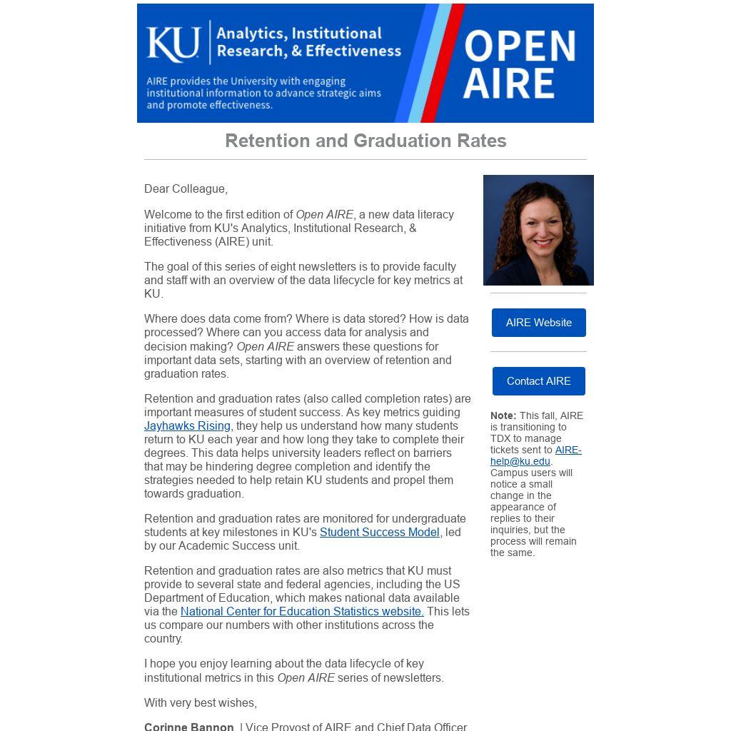 Welcome to the first edition of Open AIRE, a new data literacy initiative from KU's Analytics, Institutional Research, & Effectiveness (AIRE) unit.