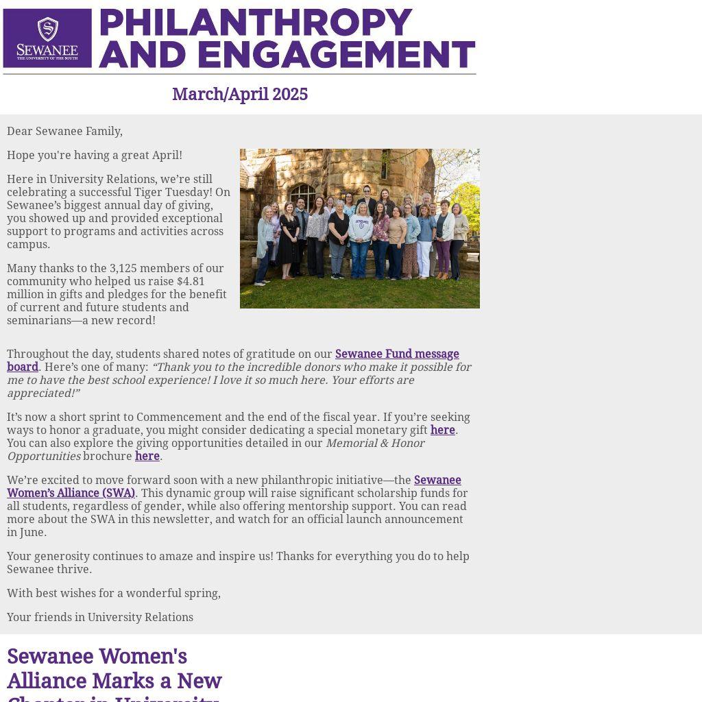 We’re excited to move forward soon with a new philanthropic initiative—the Sewanee Women’s Alliance (SWA). This dynamic group will raise significant scholarship funds for all students, regardless of gender, while also offering mentorship support. You can read more about the SWA in this newsletter, and watch for an official launch announcement in June.