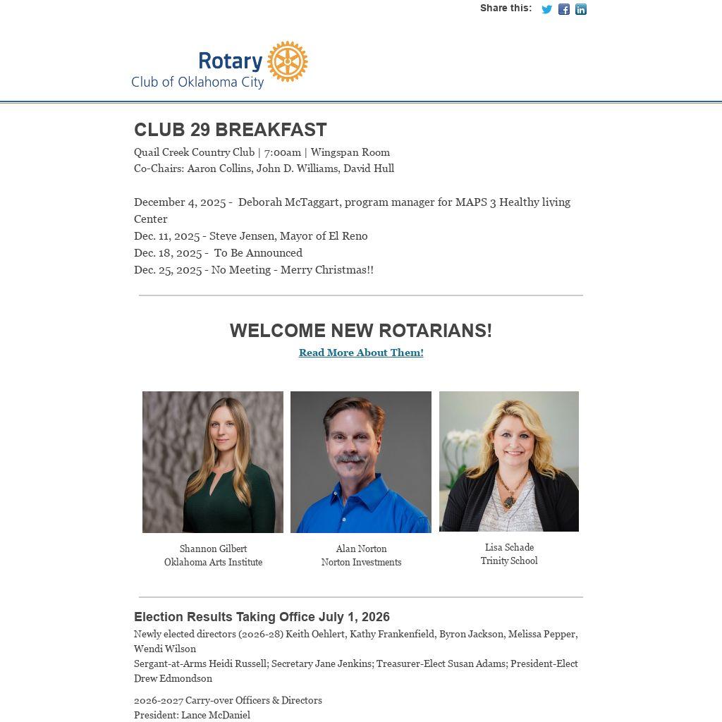 Rotary Club 29 has an online membership directory which contains current content information for all club members. The link to access the Club 29 directory can be found at the top of the home page of okcrotary.club or by clicking here.