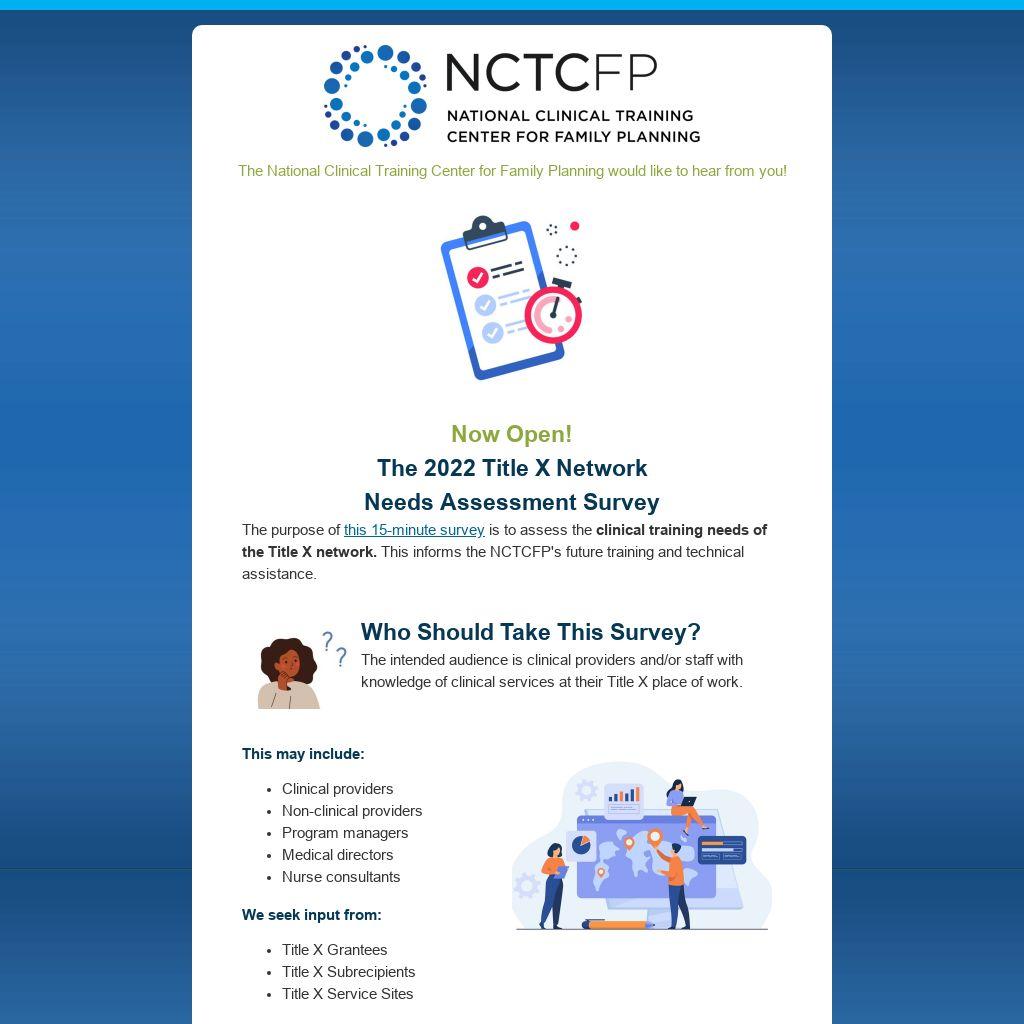 Topics: We ask about the demographics of your Title X place of work, clinical training needs, and other initiatives related to Title X service delivery.