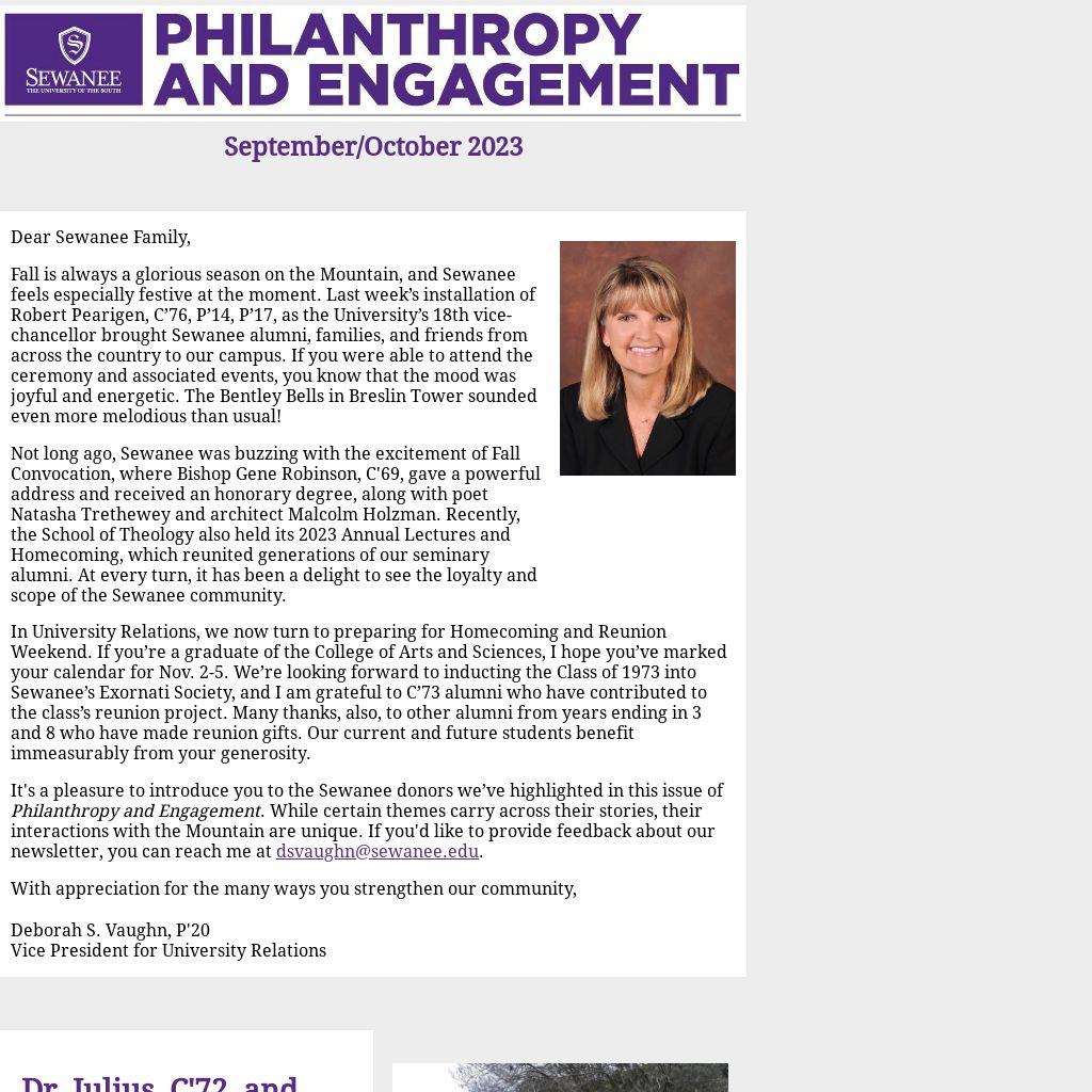 It's a pleasure to introduce you to the Sewanee donors we’ve highlighted in this issue of Philanthropy and Engagement. While certain themes carry across their stories, their interactions with the Mountain are unique. If you'd like to provide feedback about our newsletter, you can reach me at dsvaughn@sewanee.edu.