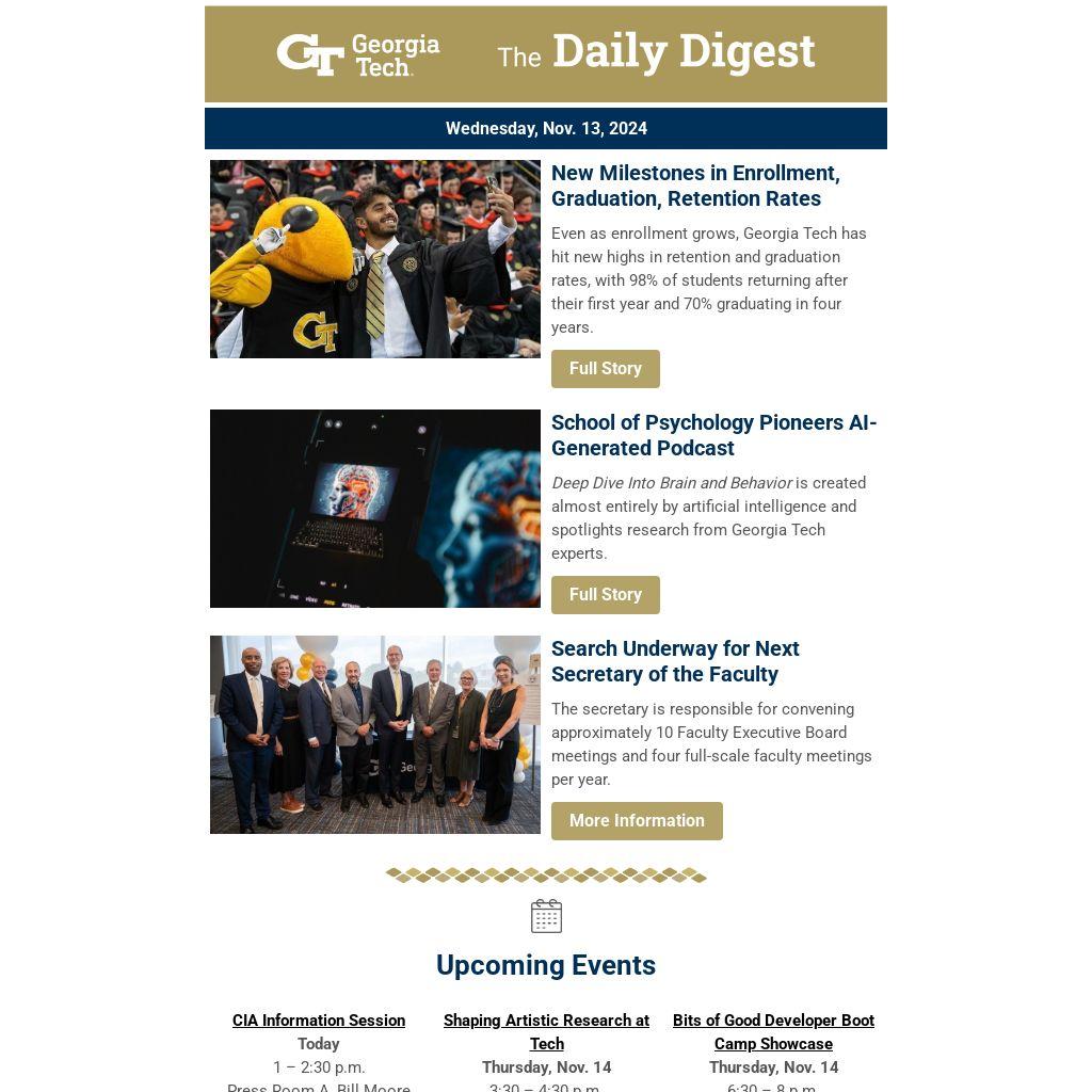 Even as enrollment grows, Georgia Tech has hit new highs in retention and graduation rates, with 98% of students returning after their first year and 70% graduating in four years.