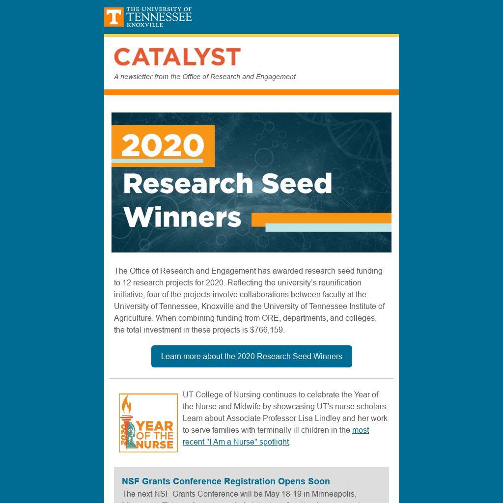 The Office of Research and Engagement has awarded research seed funding to 12 research projects for 2020. Reflecting the university’s reunification initiative, four of the projects involve collaborations between faculty at the University of Tennessee, Knoxville and the University of Tennessee Institute of Agriculture. When combining funding from ORE, departments, and colleges, the total investment in these projects is $766,159.