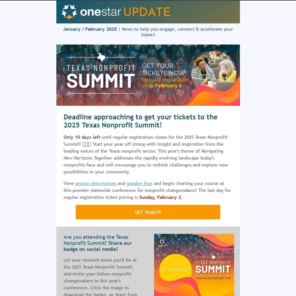 Let your network know you'll be at the 2025 Texas Nonprofit Summit, and invite your fellow nonprofit changemakers to this year's conference. Click the image to download the badge, or share from OneStar's social media channels: