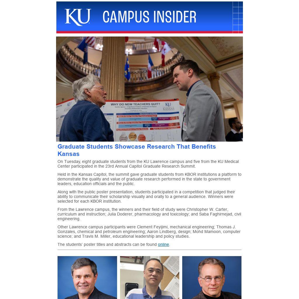 From the Lawrence campus, the winners and their field of study were Christopher W. Carter, curriculum and instruction; Julia Doderer, pharmacology and toxicology; and Saba Faghirnejad, civil engineering.