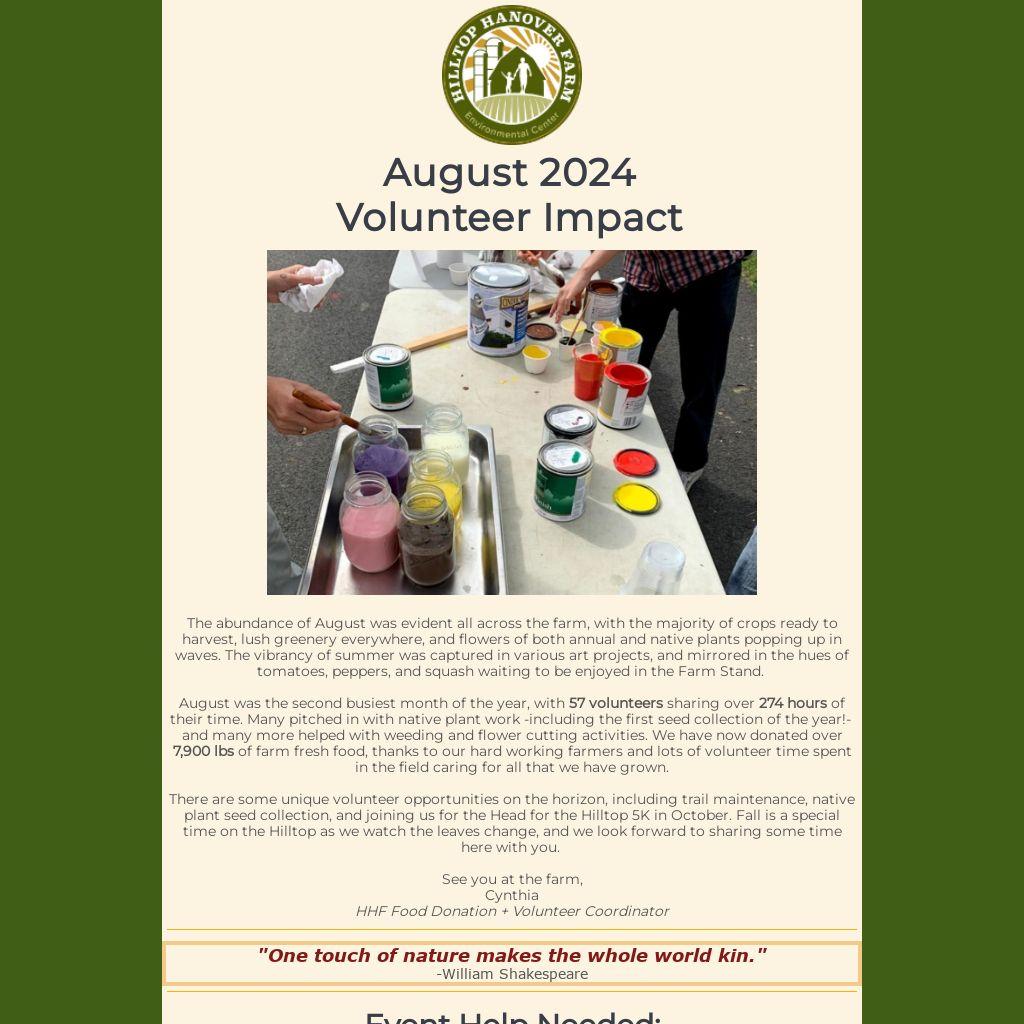 There are some unique volunteer opportunities on the horizon, including trail maintenance, native plant seed collection, and joining us for the Head for the Hilltop 5K in October. Fall is a special time on the Hilltop as we watch the leaves change, and we look forward to sharing some time here with you.