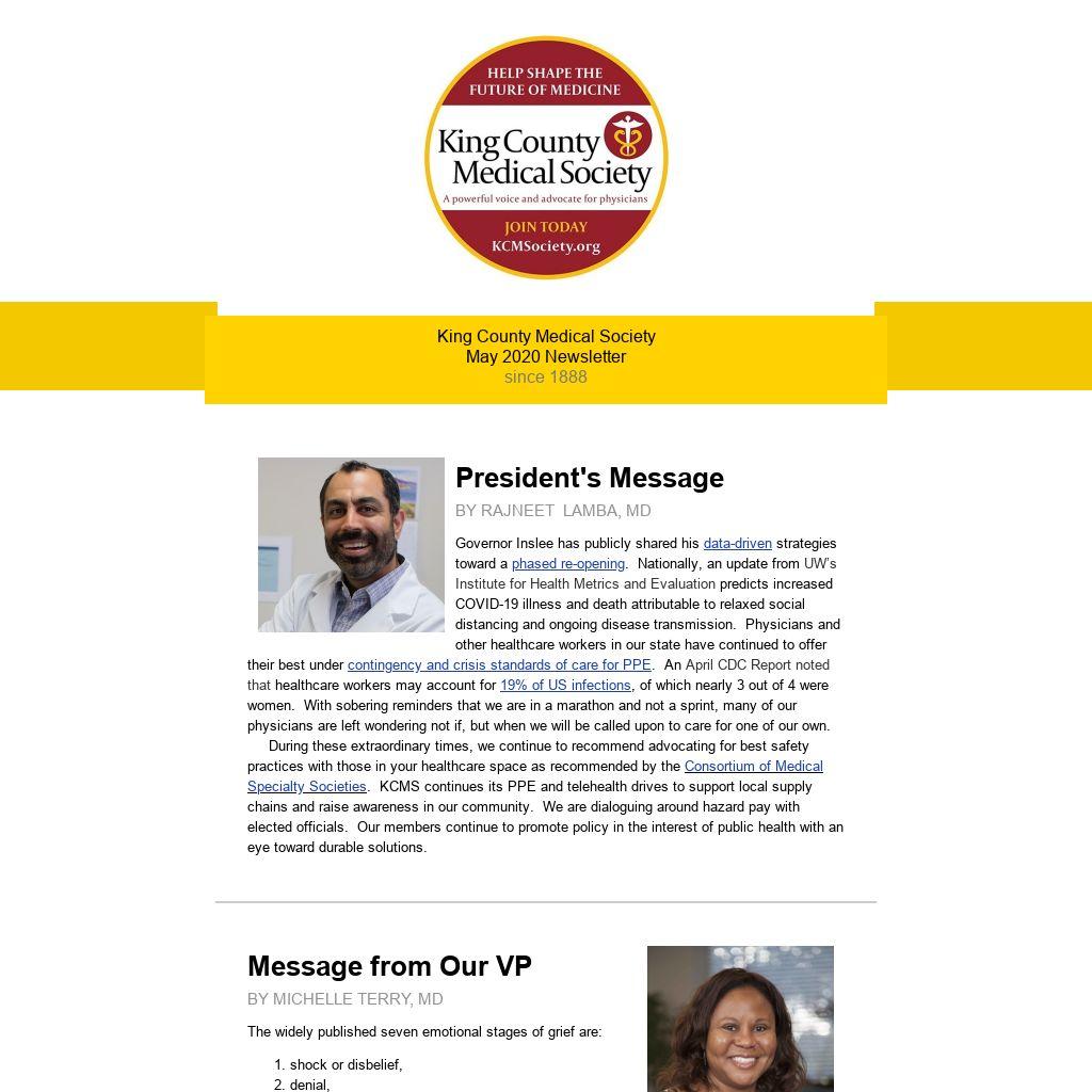 Governor Inslee has publicly shared his data-driven strategies toward a phased re-opening. Nationally, an update from UW’s Institute for Health Metrics and Evaluation predicts increased COVID-19 illness and death attributable to relaxed social distancing and ongoing disease transmission. Physicians and other healthcare workers in our state have continued to offer their best under contingency and crisis standards of care for PPE. An April CDC Report noted that healthcare workers may account for 19% of US infections, of which nearly 3 out of 4 were women. With sobering reminders that we are in a marathon and not a sprint, many of our physicians are left wondering not if, but when we will be called upon to care for one of our own. During these extraordinary times, we continue to recommend advocating for best safety practices with those in your healthcare space as recommended by the Consortium of Medical Specialty Societies. KCMS continues its PPE and telehealth drives to support local supply chains and raise awareness in our community. We are dialoguing around hazard pay with elected officials. Our members continue to promote policy in the interest of public health with an eye toward durable solutions.