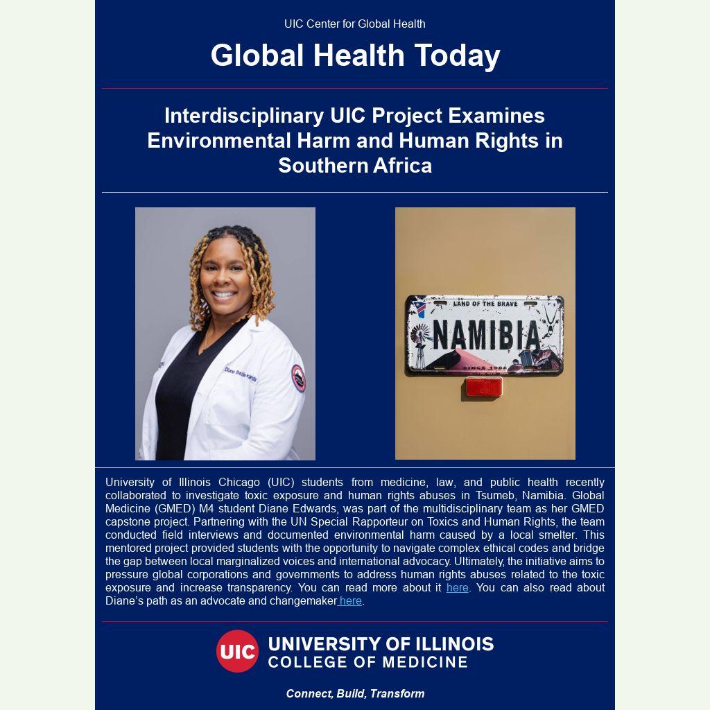 University of Illinois Chicago (UIC) students from medicine, law, and public health recently collaborated to investigate toxic exposure and human rights abuses in Tsumeb, Namibia. Global Medicine (GMED) M4 student Diane Edwards, was part of the multidisciplinary team as her GMED capstone project. Partnering with the UN Special Rapporteur on Toxics and Human Rights, the team conducted field interviews and documented environmental harm caused by a local smelter. This mentored project provided students with the opportunity to navigate complex ethical codes and bridge the gap between local marginalized voices and international advocacy. Ultimately, the initiative aims to pressure global corporations and governments to address human rights abuses related to the toxic exposure and increase transparency. You can read more about it here. You can also read about Diane’s path as an advocate and changemaker here.