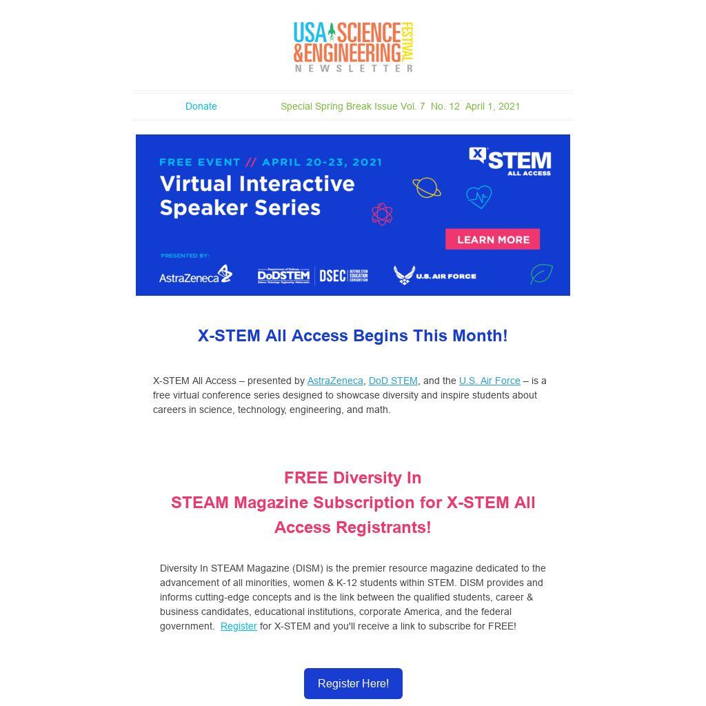Diversity In STEAM Magazine (DISM) is the premier resource magazine dedicated to the advancement of all minorities, women & K-12 students within STEM. DISM provides and informs cutting-edge concepts and is the link between the qualified students, career & business candidates, educational institutions, corporate America, and the federal government. Register for X-STEM and you'll receive a link to subscribe for FREE!