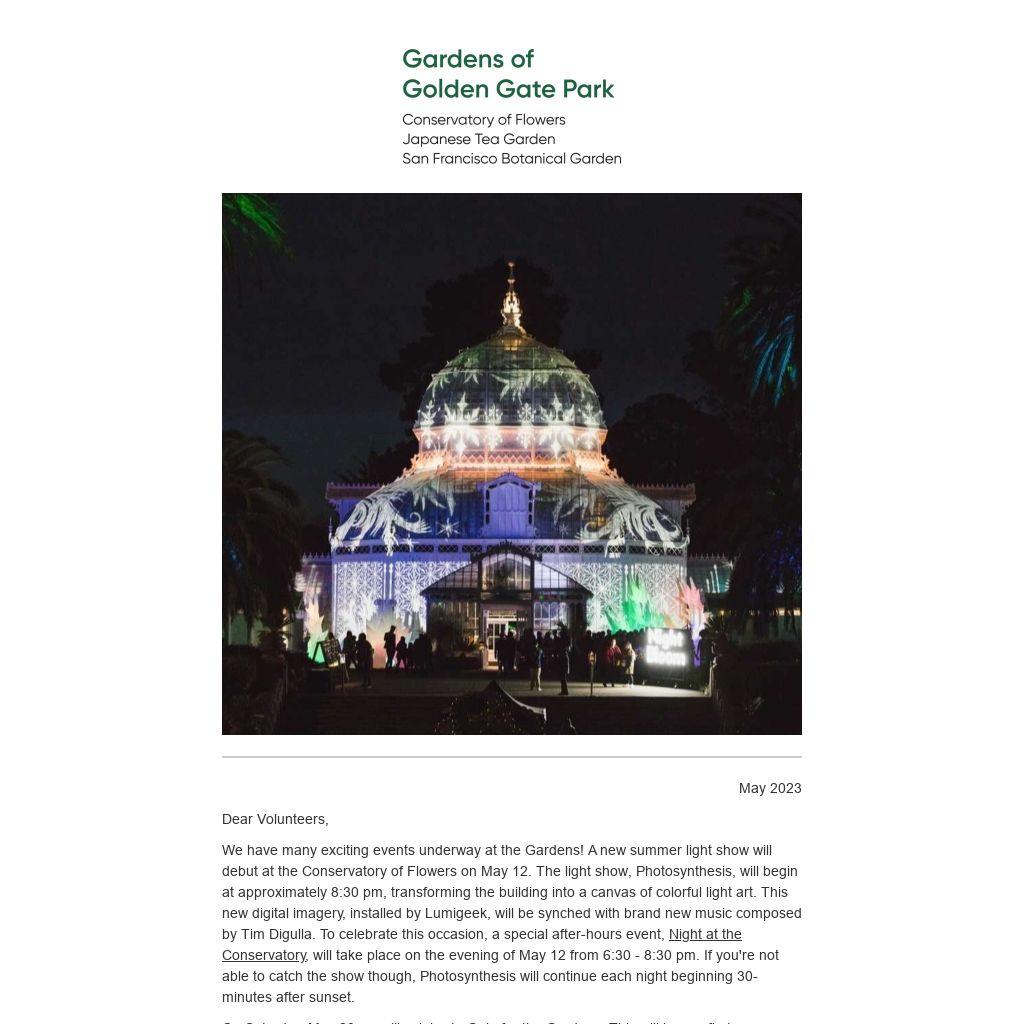We have many exciting events underway at the Gardens! A new summer light show will debut at the Conservatory of Flowers on May 12. The light show, Photosynthesis, will begin at approximately 8:30 pm, transforming the building into a canvas of colorful light art. This new digital imagery, installed by Lumigeek, will be synched with brand new music composed by Tim Digulla. To celebrate this occasion, a special after-hours event, Night at the Conservatory, will take place on the evening of May 12 from 6:30 - 8:30 pm. If you're not able to catch the show though, Photosynthesis will continue each night beginning 30-minutes after sunset.