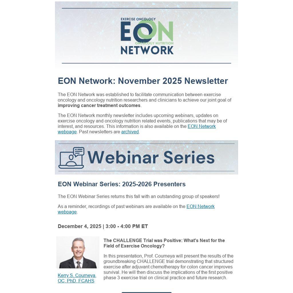 The EON Network monthly newsletter includes upcoming webinars, updates on exercise oncology and oncology nutrition related events, publications that may be of interest, and resources. This information is also available on the EON Network webpage. Past newsletters are archived.