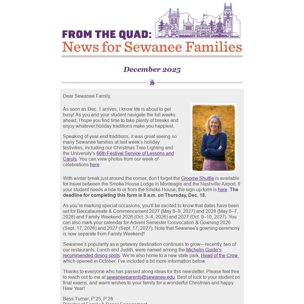 Thanks to everyone who has passed along ideas for this newsletter. Please feel free to reach out to me at sewaneeparents@sewanee.edu. Best of luck to your student on final exams, and warm wishes to your family for a wonderful Christmas and happy New Year!