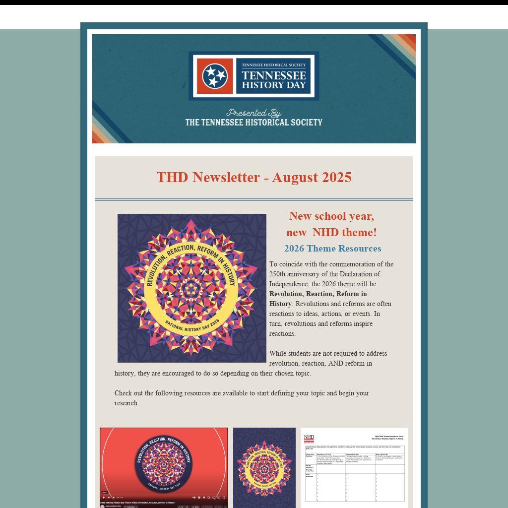 TNCHE ConferenceYou are invited to be a part of the 2025 Tennessee Council for History Educational (TNCHE) conference on September 30 - October 1, at the Martin Professional Development Center in Nashville. The 2025 theme is Doing History. If you are interested in submitting a session or poster proposal, there is still time! Proposals are being accepted through August 22nd. For proposal details, click here.