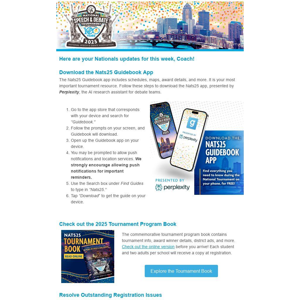 The Nats25 Guidebook app includes schedules, maps, award details, and more. It is your most important tournament resource. Follow these steps to download the Nats25 app, presented by Perplexity, the AI research assistant for debate teams.
