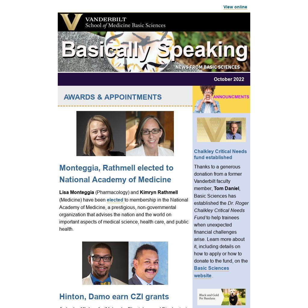 This newsletter recognizes the achievements and latest discoveries of students, postdocs, faculty, and staff associated with Basic Sciences departments, centers, and cores or who carry out basic biomedical research at Vanderbilt.