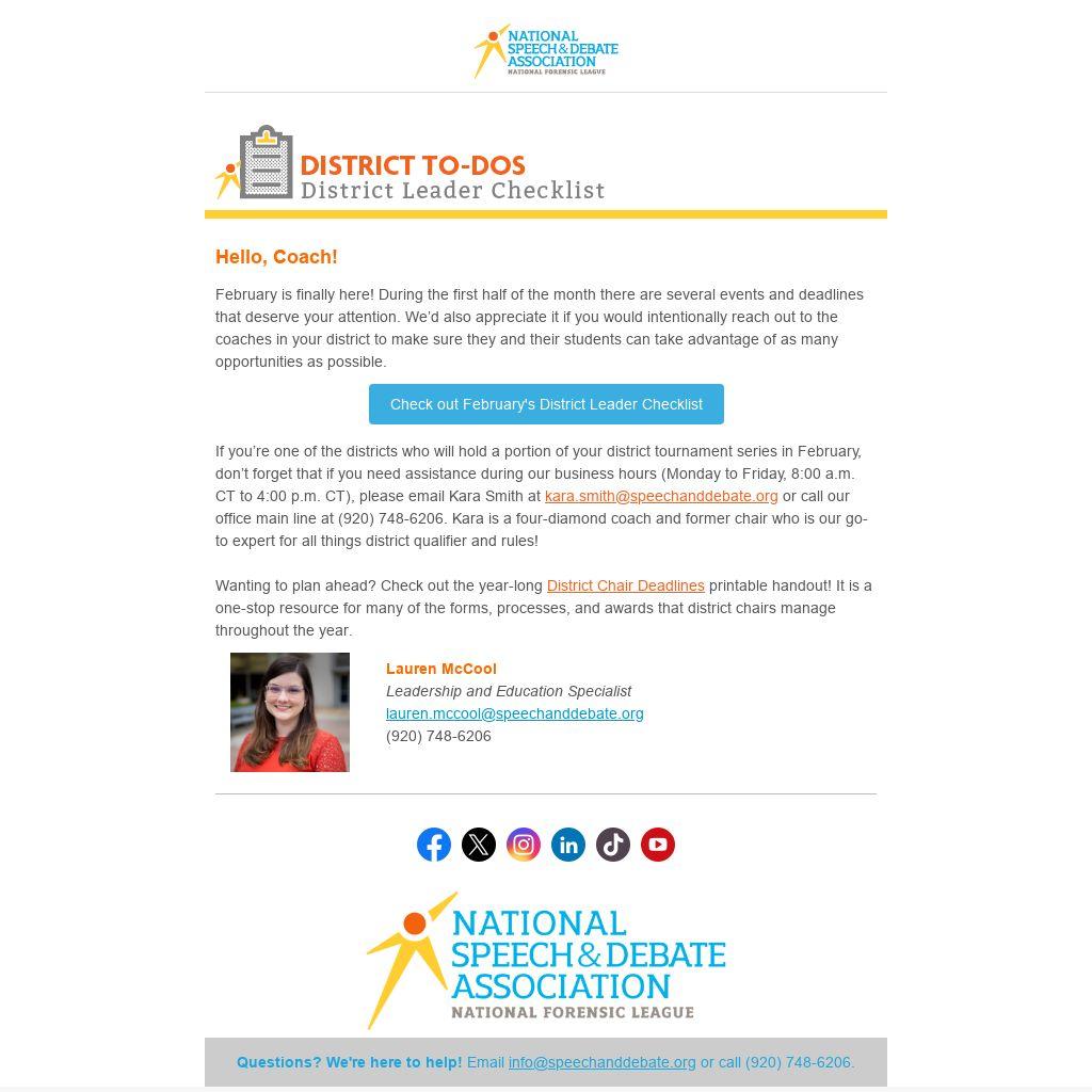 If you’re one of the districts who will hold a portion of your district tournament series in February, don’t forget that if you need assistance during our business hours (Monday to Friday, 8:00 a.m. CT to 4:00 p.m. CT), please email Kara Smith at kara.smith@speechanddebate.org or call our office main line at (920) 748-6206. Kara is a four-diamond coach and former chair who is our go-to expert for all things district qualifier and rules!