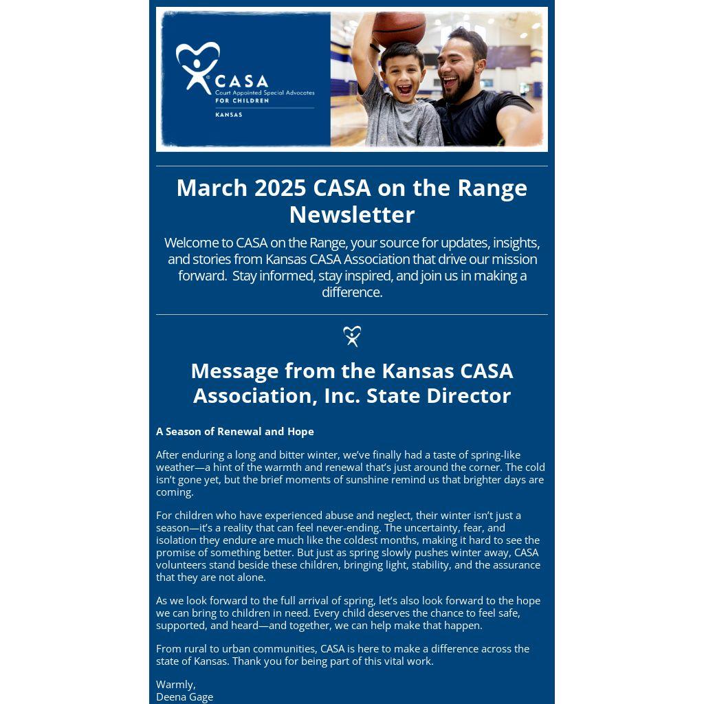 Welcome to CASA on the Range, your source for updates, insights, and stories from Kansas CASA Association that drive our mission forward. Stay informed, stay inspired, and join us in making a difference.