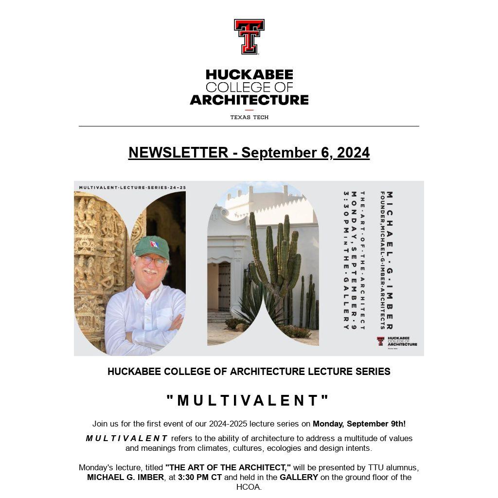 Monday's lecture, titled "THE ART OF THE ARCHITECT," will be presented by TTU alumnus, MICHAEL G. IMBER, at 3:30 PM CT and held in the GALLERY on the ground floor of the HCOA.