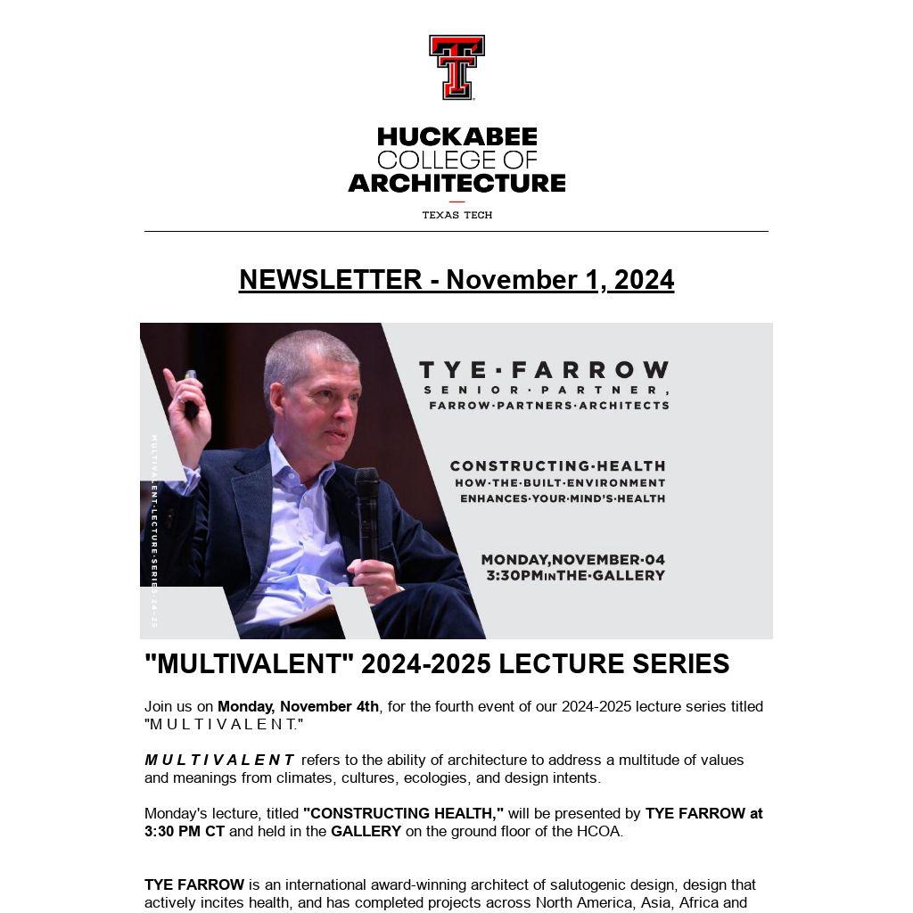 Monday's lecture, titled "CONSTRUCTING HEALTH," will be presented by TYE FARROW at 3:30 PM CT and held in the GALLERY on the ground floor of the HCOA.