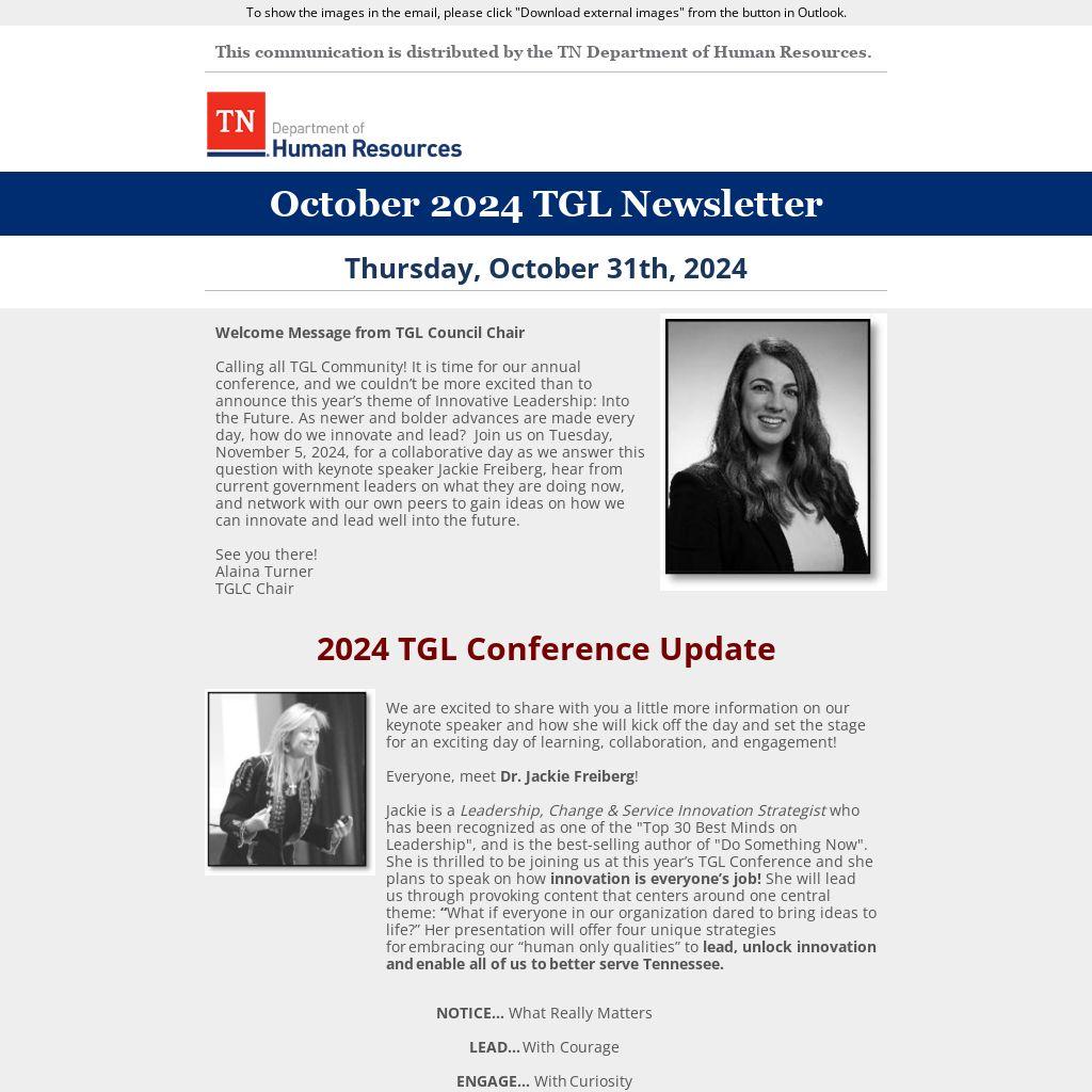 Calling all TGL Community! It is time for our annual conference, and we couldn’t be more excited than to announce this year’s theme of Innovative Leadership: Into the Future. As newer and bolder advances are made every day, how do we innovate and lead? Join us on Tuesday, November 5, 2024, for a collaborative day as we answer this question with keynote speaker Jackie Freiberg, hear from current government leaders on what they are doing now, and network with our own peers to gain ideas on how we can innovate and lead well into the future.