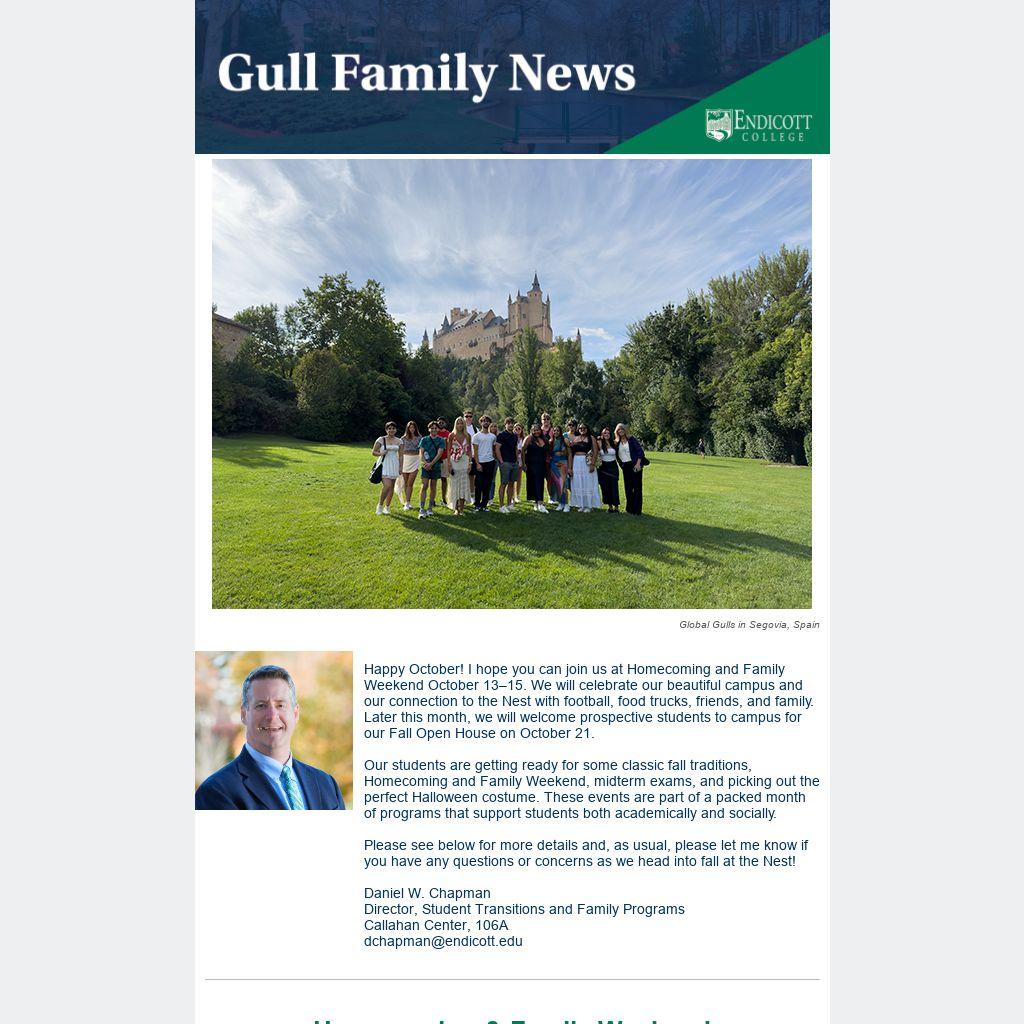 Is your student an Endicott Scholar, Leadership Scholar, or involved in an Honor Society? We hope you'll join us at Homecoming & Parents Weekend for the Honors Reception to celebrate their accomplishments. This event will be held on October 13 from 5:30-6:30 p.m. in the Gerrish School of Business & Judge Science Center Lobby. Register here.