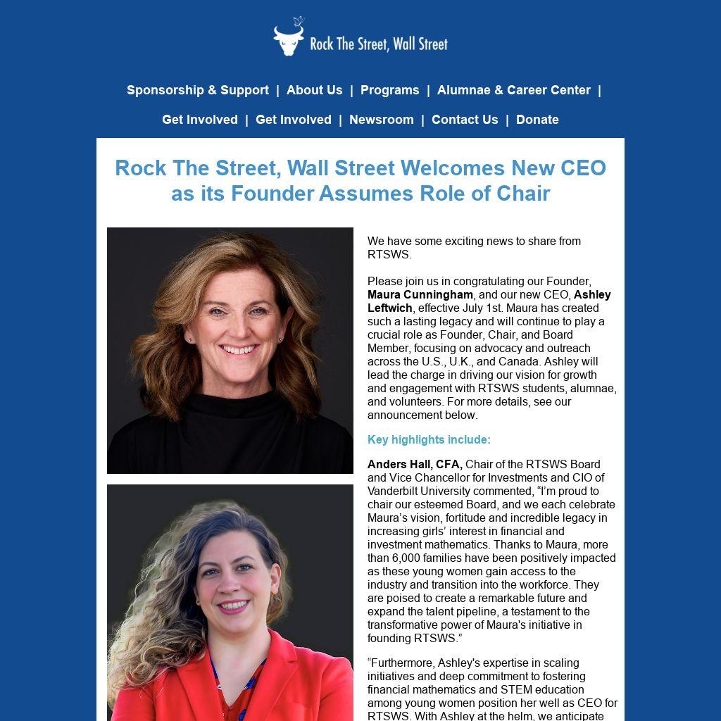 Please join us in congratulating our Founder, Maura Cunningham, and our new CEO, Ashley Leftwich, effective July 1st. Maura has created such a lasting legacy and will continue to play a crucial role as Founder, Chair, and Board Member, focusing on advocacy and outreach across the U.S., U.K., and Canada. Ashley will lead the charge in driving our vision for growth and engagement with RTSWS students, alumnae, and volunteers. For more details, see our announcement below.