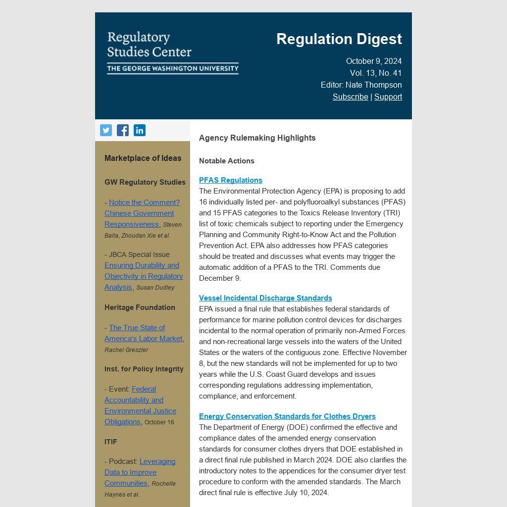 Notable ActionsPFAS Regulations The Environmental Protection Agency (EPA) is proposing to add 16 individually listed per- and polyfluoroalkyl substances (PFAS) and 15 PFAS categories to the Toxics Release Inventory (TRI) list of toxic chemicals subject to reporting under the Emergency Planning and Community Right-to-Know Act and the Pollution Prevention Act. EPA also addresses how PFAS categories should be treated and discusses what events may trigger the automatic addition of a PFAS to the TRI. Comments due December 9.