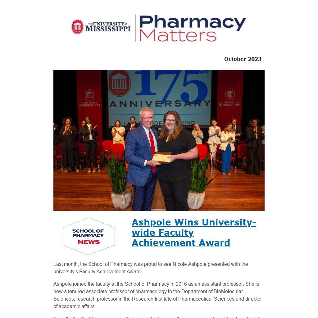 Last month, the School of Pharmacy was proud to see Nicole Ashpole presented with the university's Faculty Achievement Award.