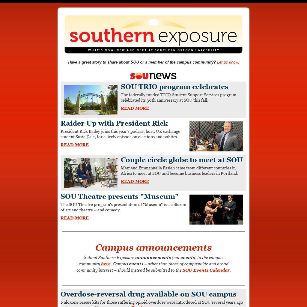 Submit Southern Exposure announcements (not events) to the campus community here. Campus events – other than those of campuswide and broad community interest – should instead be submitted to the SOU Events Calendar.