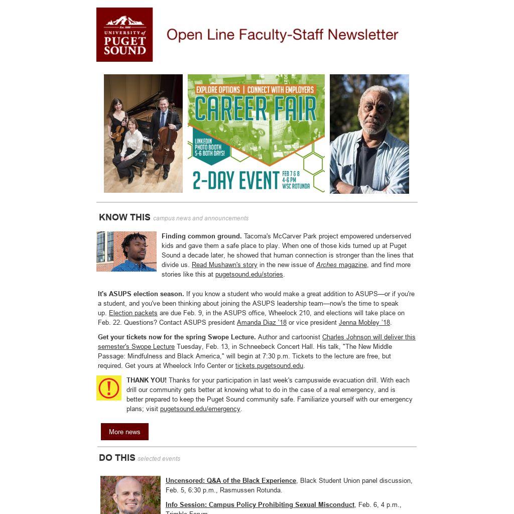 THANK YOU! Thanks for your participation in last week's campuswide evacuation drill. With each drill our community gets better at knowing what to do in the case of a real emergency, and is better prepared to keep the Puget Sound community safe. Familiarize yourself with our emergency plans; visit pugetsound.edu/emergency.