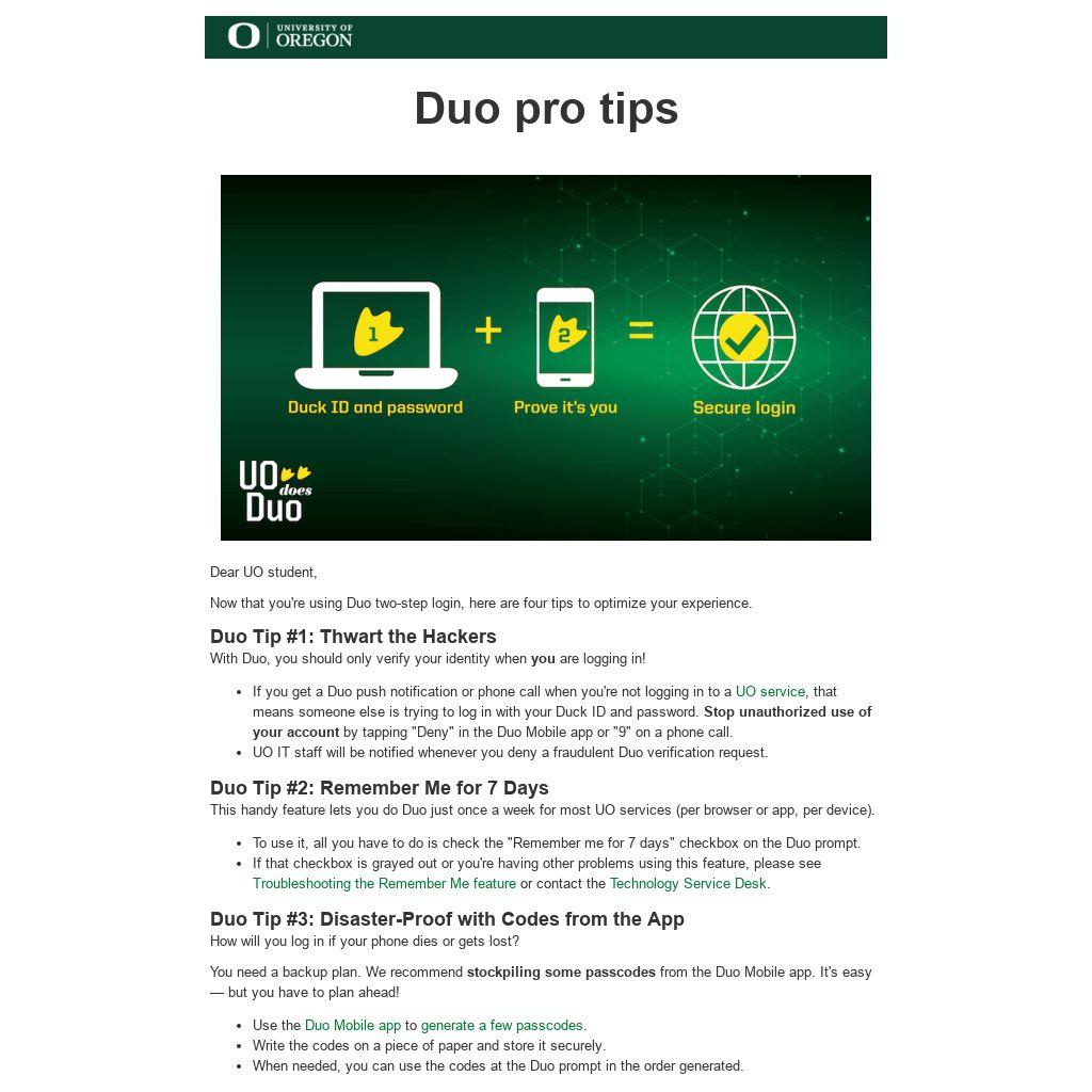 Need help with Duo? Contact the Technology Service Desk for tech support 6:00 a.m.–midnight every day, except UO breaks and holidays: