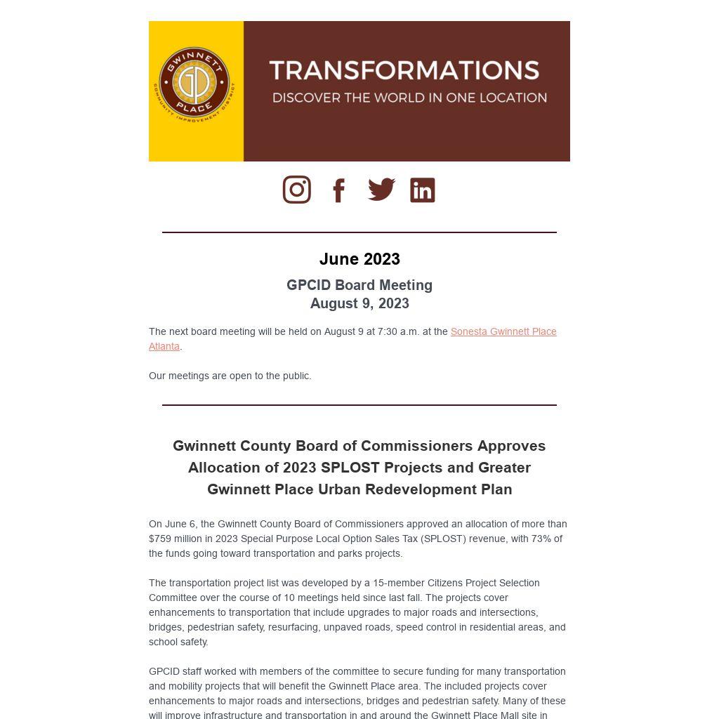 Gwinnett County Board of Commissioners Approves Allocation of 2023 SPLOST Projects and Greater Gwinnett Place Urban Redevelopment Plan