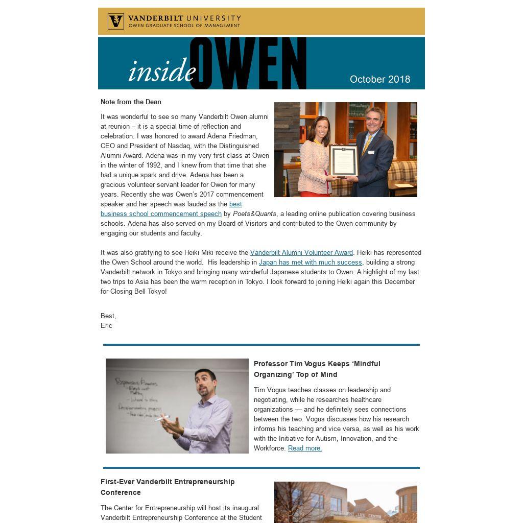 | Note from the Dean It was wonderful to see so many Vanderbilt Owen alumni at reunion – it is a special time of reflection and celebration. I was honored to award Adena Friedman, CEO and President of Nasdaq, with the Distinguished Alumni Award. Adena was in my very first class at Owen in the winter of 1992, and I knew from that time that she had a unique spark and drive. Adena has been a gracious volunteer servant leader for Owen for many years. Recently she was Owen’s 2017 commencement speaker and her speech was lauded as the best business school commencement speech by Poets&Quants, a leading online publication covering business schools. Adena has also served on my Board of Visitors and contributed to the Owen community by engaging our students and faculty.