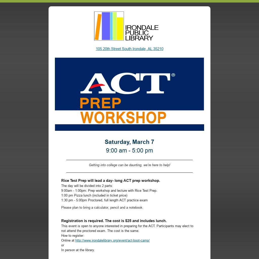 Rice Test Prep will lead a day- long ACT prep workshop.
