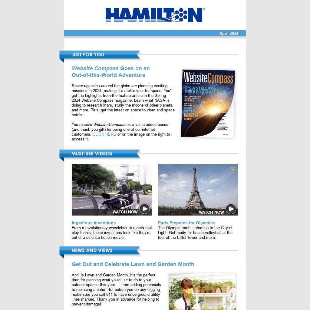 Website Compass Goes on an Out-of-this-World Adventure Space agencies around the globe are planning exciting missions in 2024, making it a stellar year for space. You'll get the highlights from the feature article in the Spring 2024 Website Compass magazine. Learn what NASA is doing to research Mars, study the moons of other planets, and more. Plus, get the latest on space tourism and space hotels. You receive Website Compass as a value-added bonus (and thank you gift) for being one of our internet customers. CLICK HERE or on the image on the right to access it. |