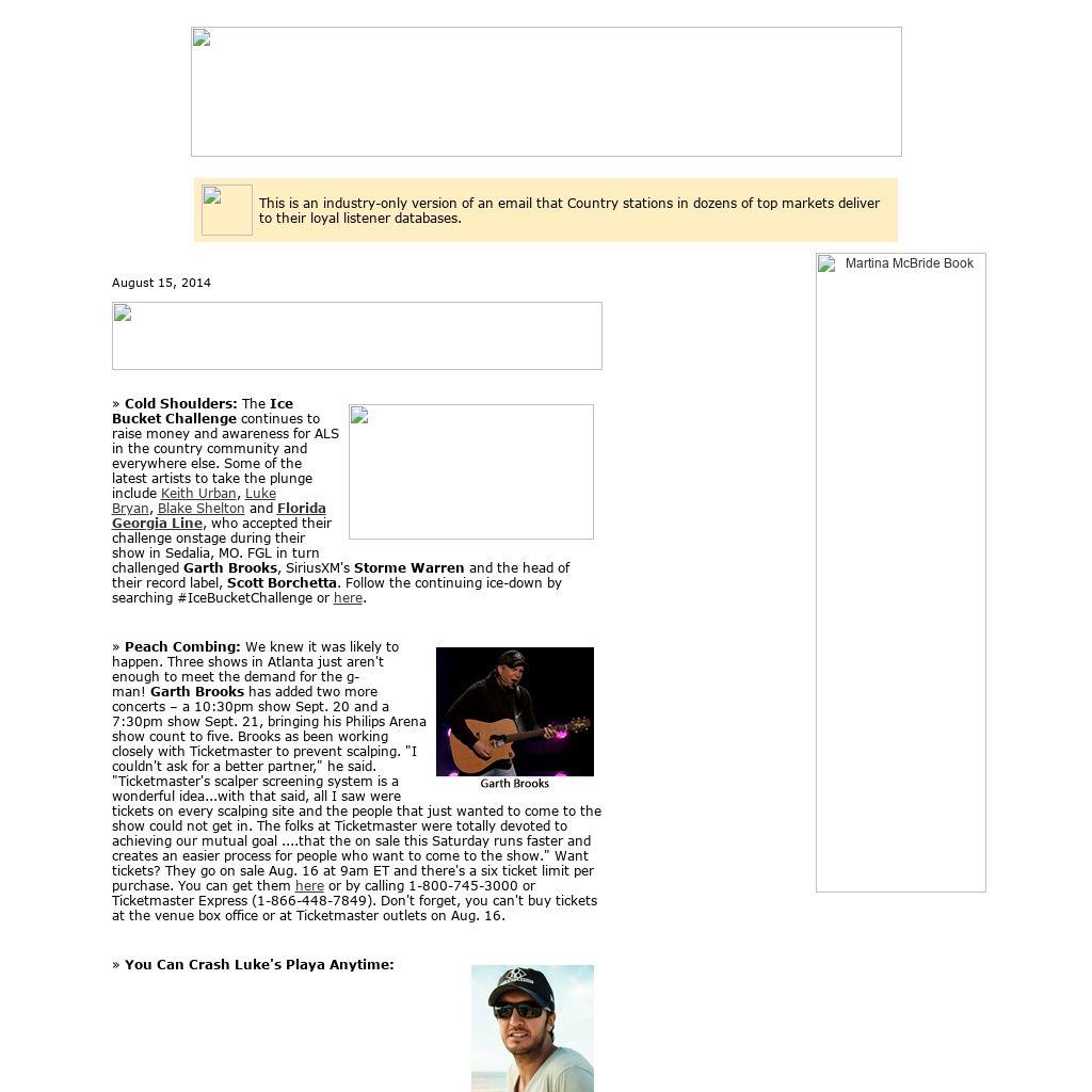 BirthdaysFriday (8/15): Jimmy Webb, Paul Jefferson, Danelle Leverett (the JaneDear girls), the late Rose Maddox, the late Don Rich. Saturday (8/16): Ashton Shepherd, Dan Smyers (Dan + Shay), Emily Robison (Dixie Chicks), Billy Joe Shaver. Sunday (8/17): Kevin Welch. Monday (8/18): Steve Wilkinson (formerly of The Wilkinsons). On TVFriday (8/15): Martina McBride, The Arsenio Hall Show (syndicated repeat). Sunday (8/17): Brad Paisley, Rising Star (ABC). Monday (8/11): Dwight Yoakam, Under The Dome (CBS). Upcoming Album ReleasesAug. 19 Various Nashville Outlaws: A Tribute To Mötley Crüe Chase Rice Ignite The Night Randy Travis Influence Vol. 2: The Man I Am Various Look Again To The Wind: Johnny Cash's Bitter Tears Revisited Joel Crouse Even The River Runs Sarah Dunn Band You Or The Whiskey Aug. 25 Brad Paisley Moonshine In The Trunk Aug. 25 Brushville Self-Titled Lenny Cooper The Grind Sep. 2 Terri Clark Some Songs Sep. 9 Lee Brice I Don't Dance Dustin Lynch Where It's At Sep. 16 Tim McGraw Sundown Heaven Town Sep. 23 Kenny Chesney The Big Revival Lee Ann Womack The Way I'm Livin' Big & Rich Gravity Sep. 30 Lady Antebellum 747 Blake Shelton Bringing Back The Sunshine Marty Stuart Saturday Night & Sunday Morning Oct. 21 Little Big Town Pain Killer Oct. 28 Stoney Larue Aviator Nov. 4 The Doobie Brothers Southbound |